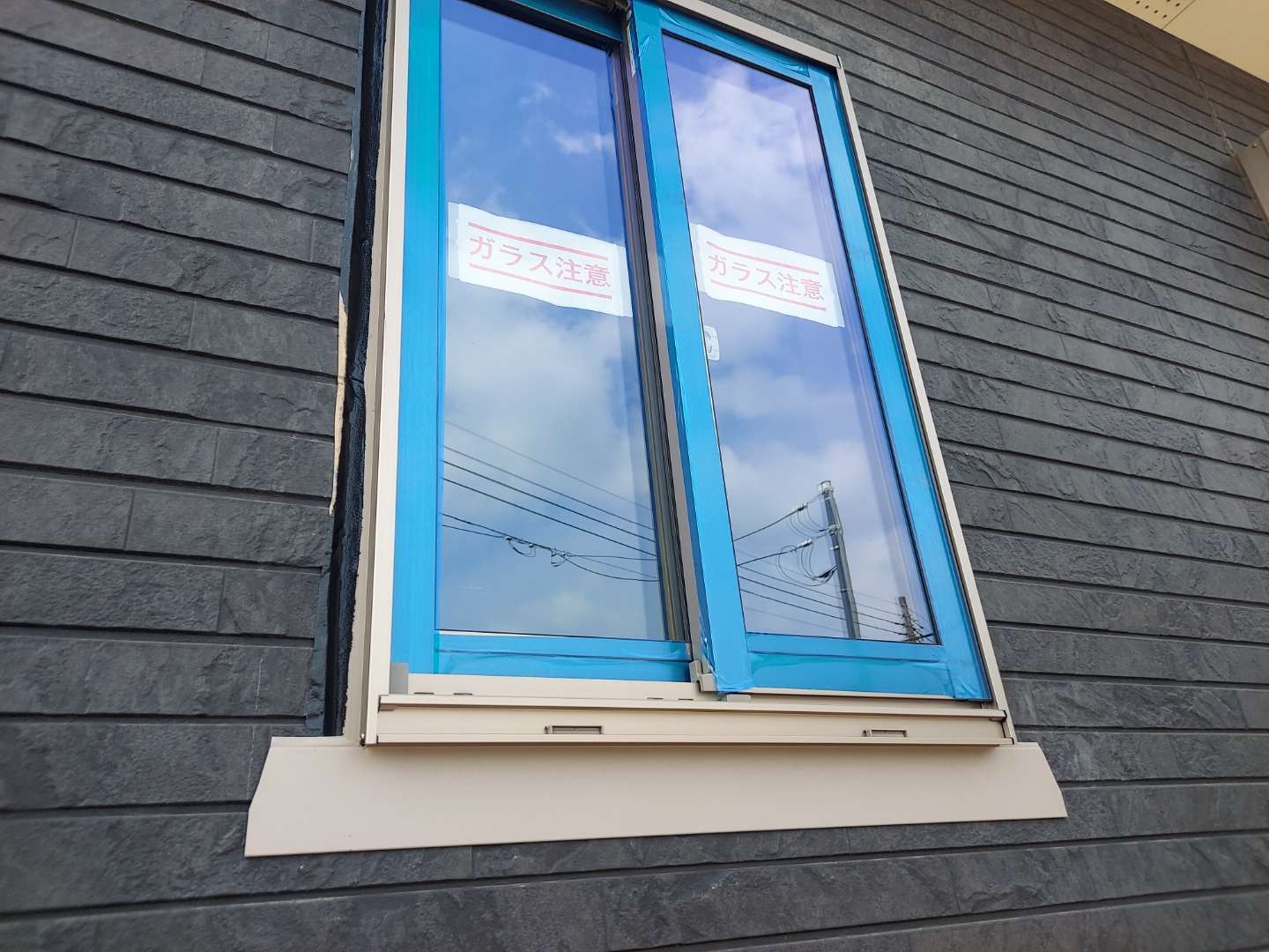 最初にブチルテープを、サッシの耳周りに貼り付けて防水処理をします↓