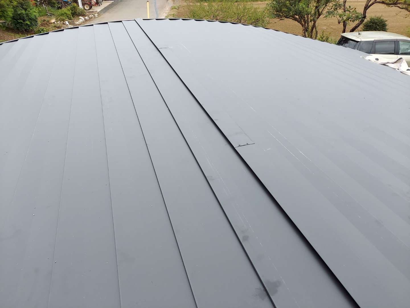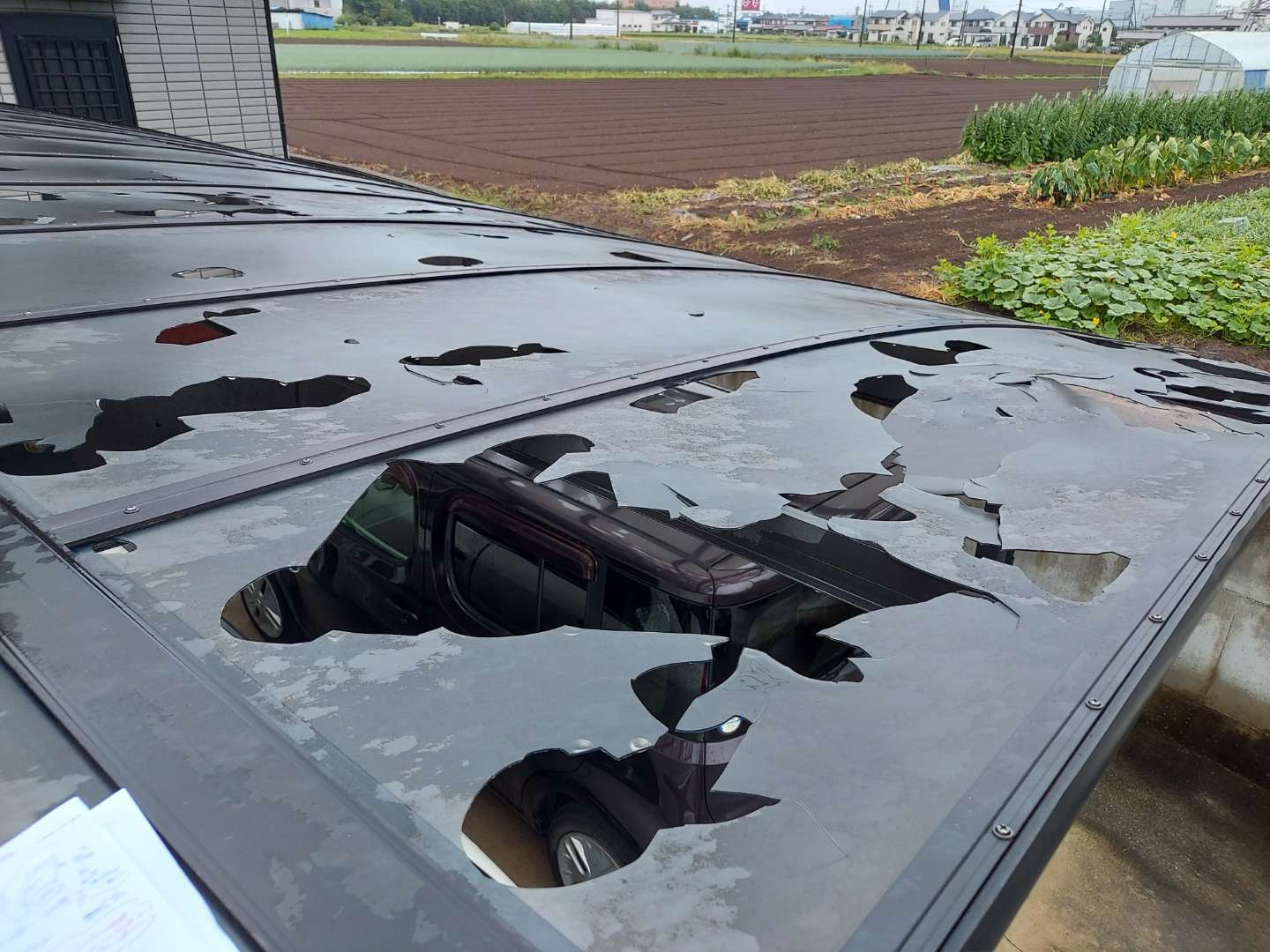 今回の被害状況を踏まえて、また同じような雹が降っても、被害が出ないことを優先して考え、ガルバリウム鋼板で施工してみては、という提案をいただき、今回の工事に至りました。