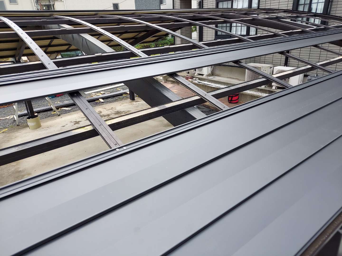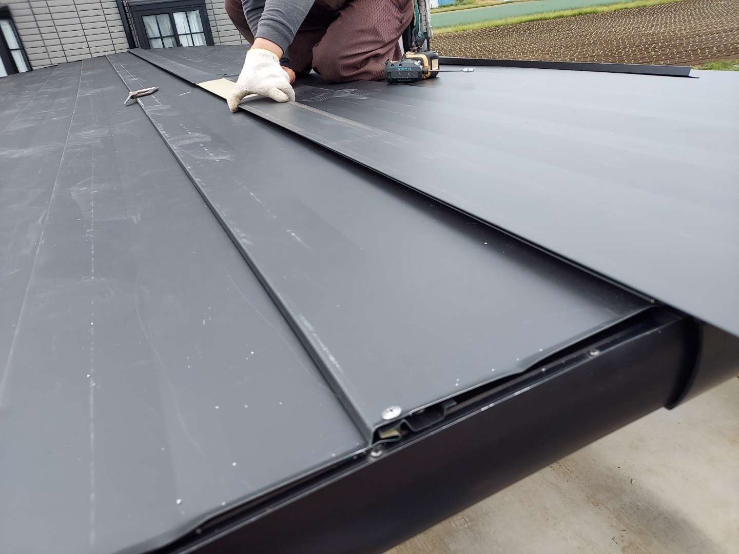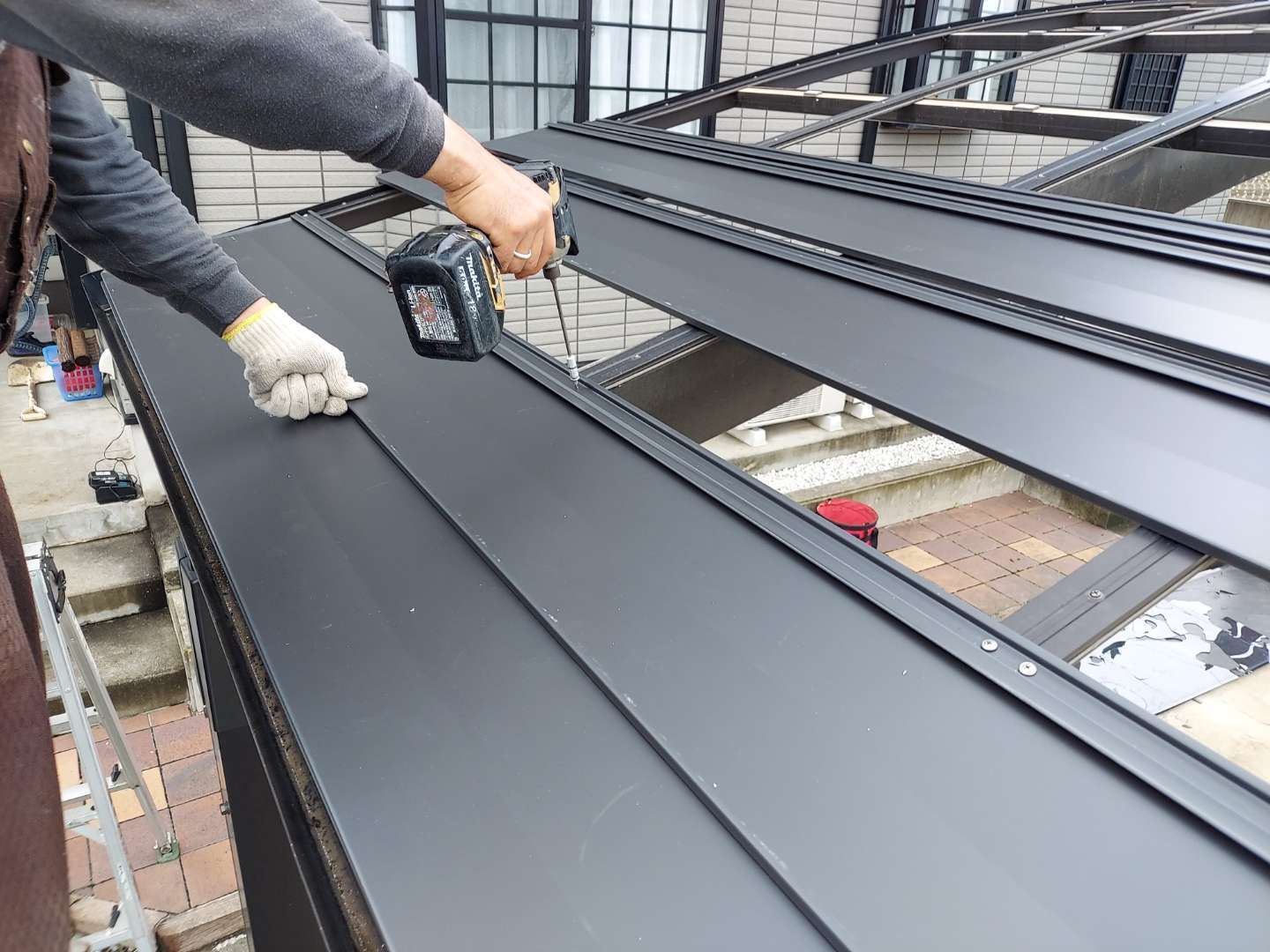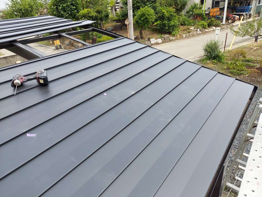 一般的な屋根材は、厚みは0.35mmが主流ですが、下地がアルミ骨組みなので、0.5mmと厚もので施工しました。