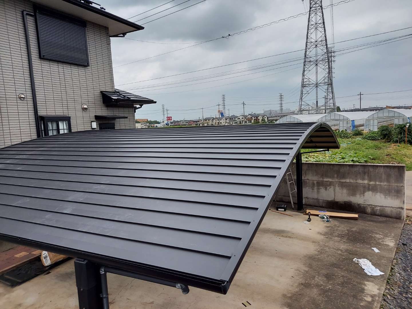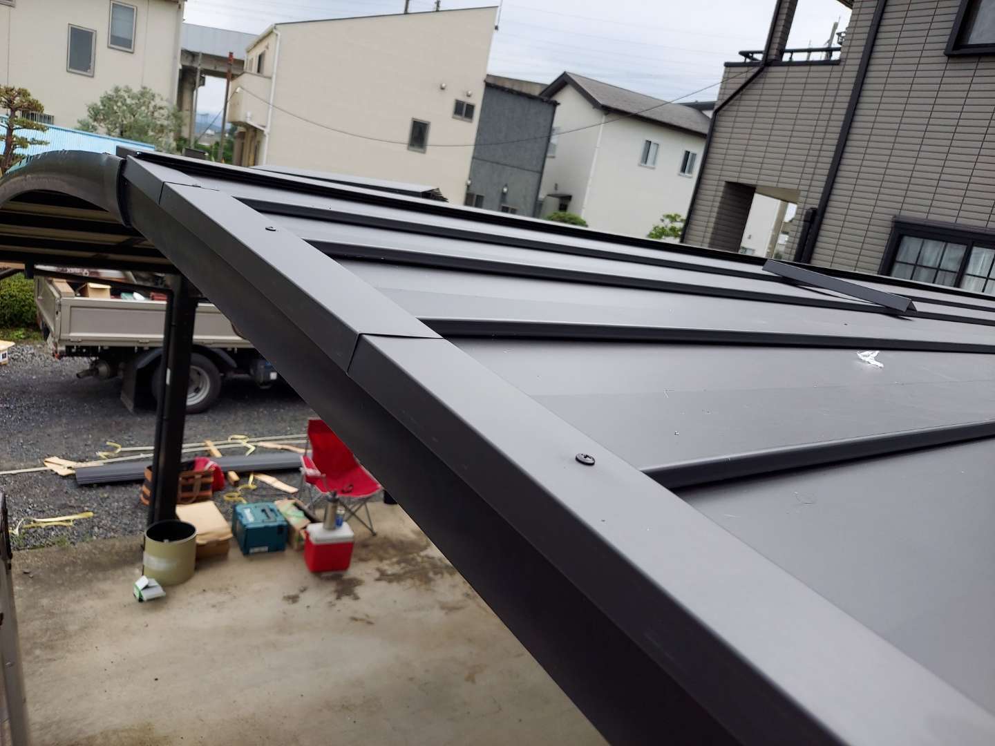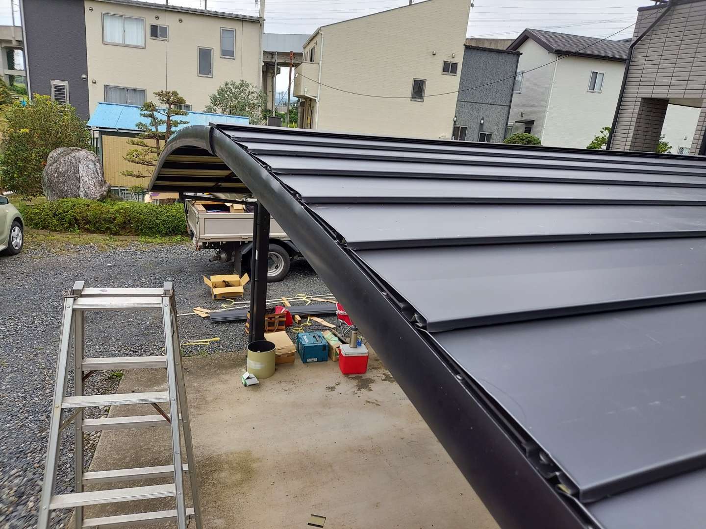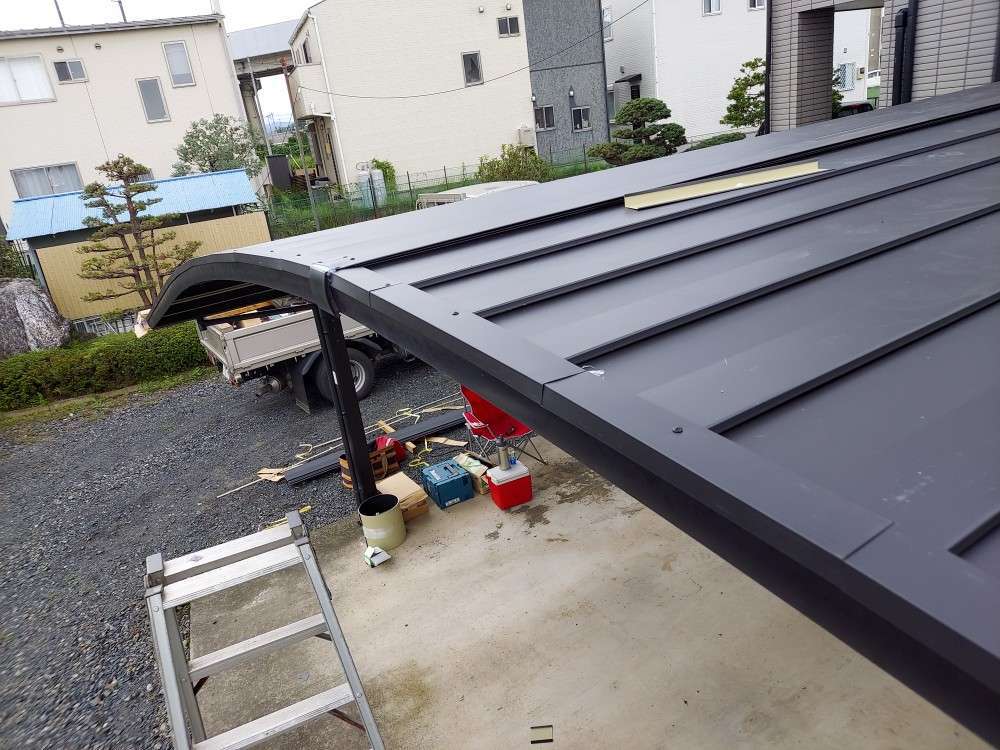 カーポートへガルバリウム鋼板を施工する工事は、自社では初めての工事で、前例がなかったので仕上がりがどのようになるか、多少の懸念がありましたが、完成してみるととても綺麗な仕上がりで見栄えも良く、お客様も大変喜んでくださいました。