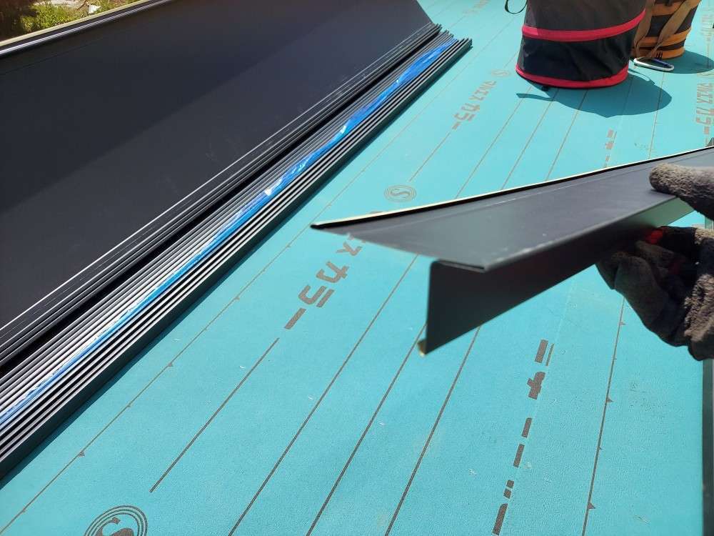 屋根本体が葺きあがり、次に軒先に樹脂製のキャップを取り付け作業(下写真)に入ります。