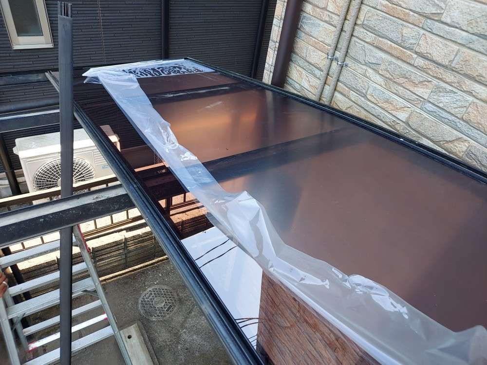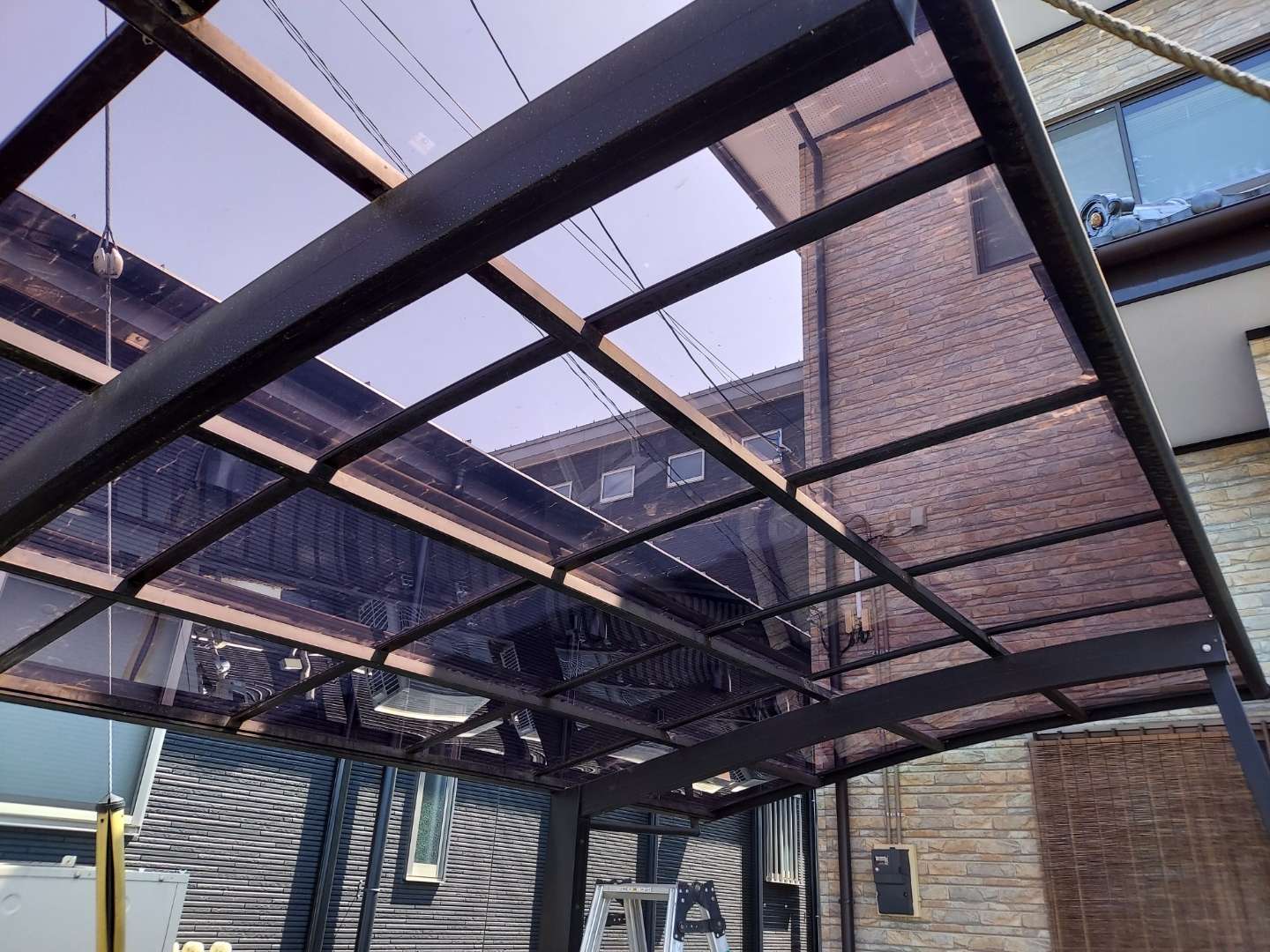 新設屋根材は、ポリカプレート2mm厚ブロンズ色を使用しました。