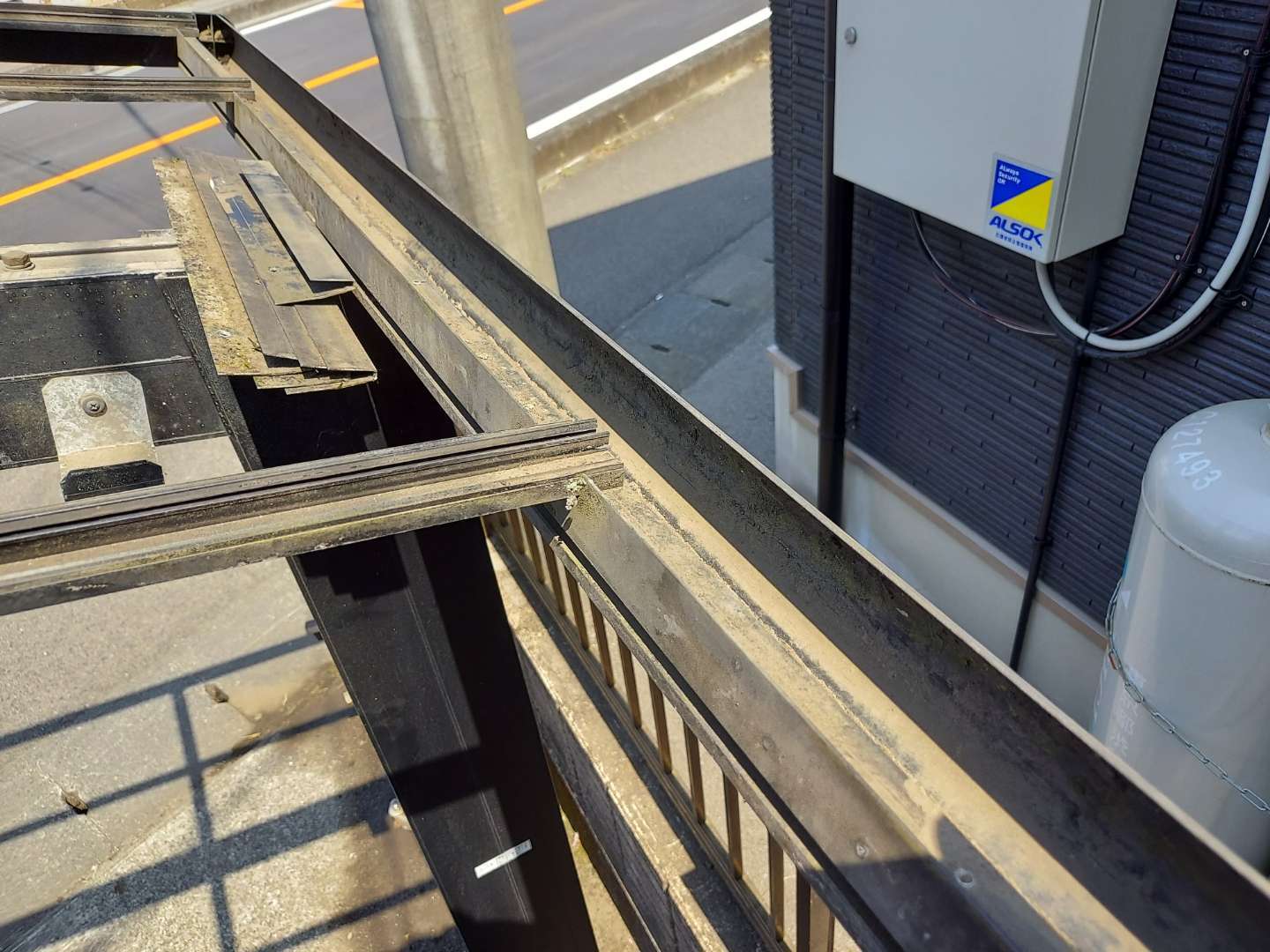 このタイプのカーポートの場合、屋根を外した時しか、雨樋の掃除が出来ないので、この機会にゴミ詰まりを取り除きます。