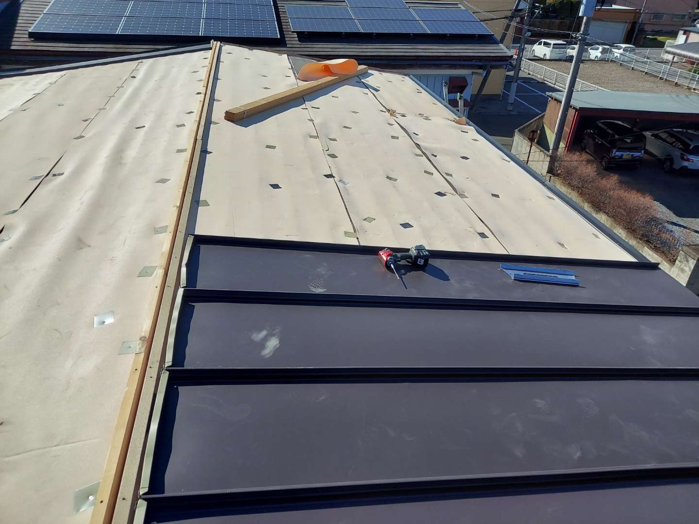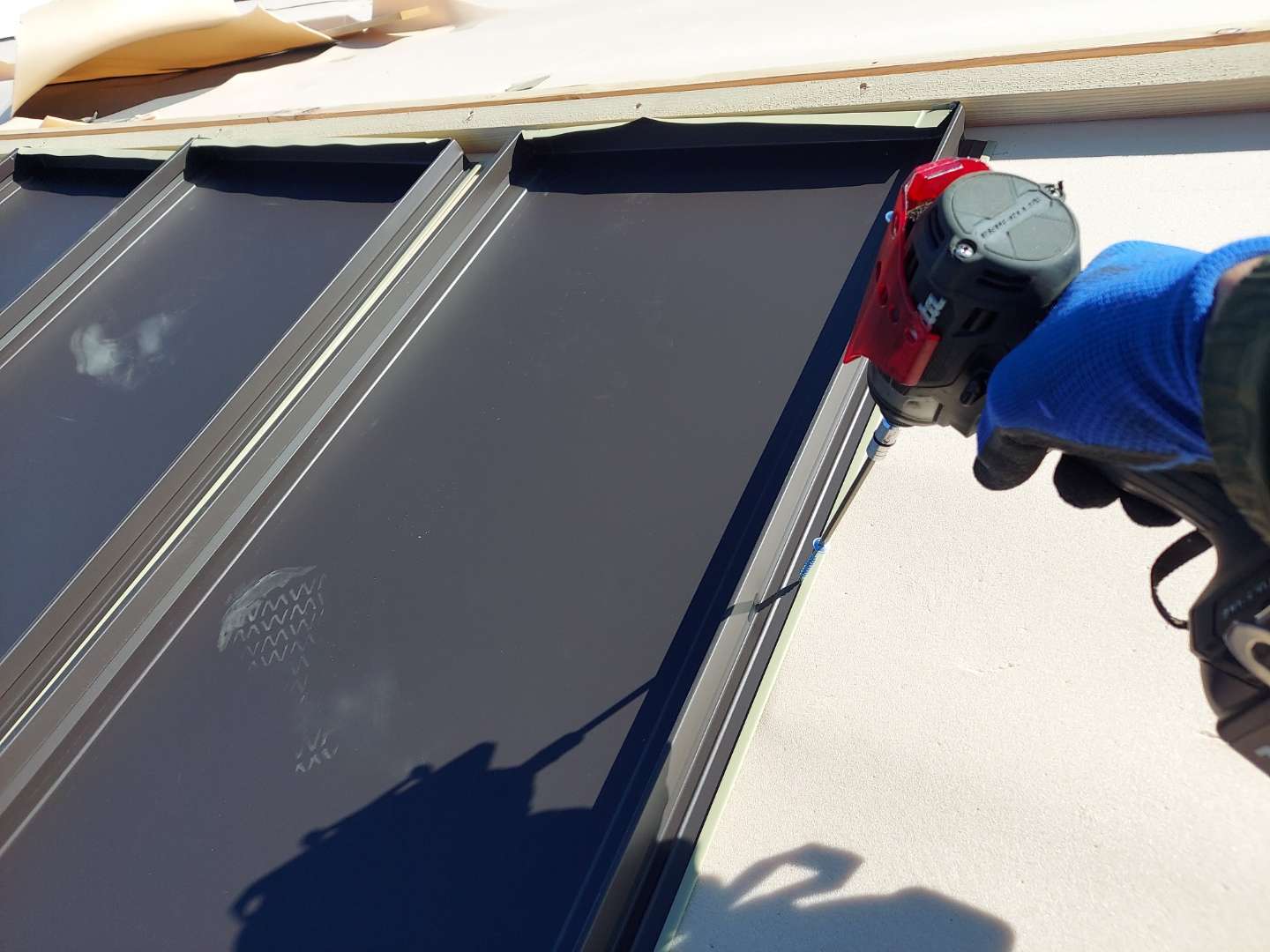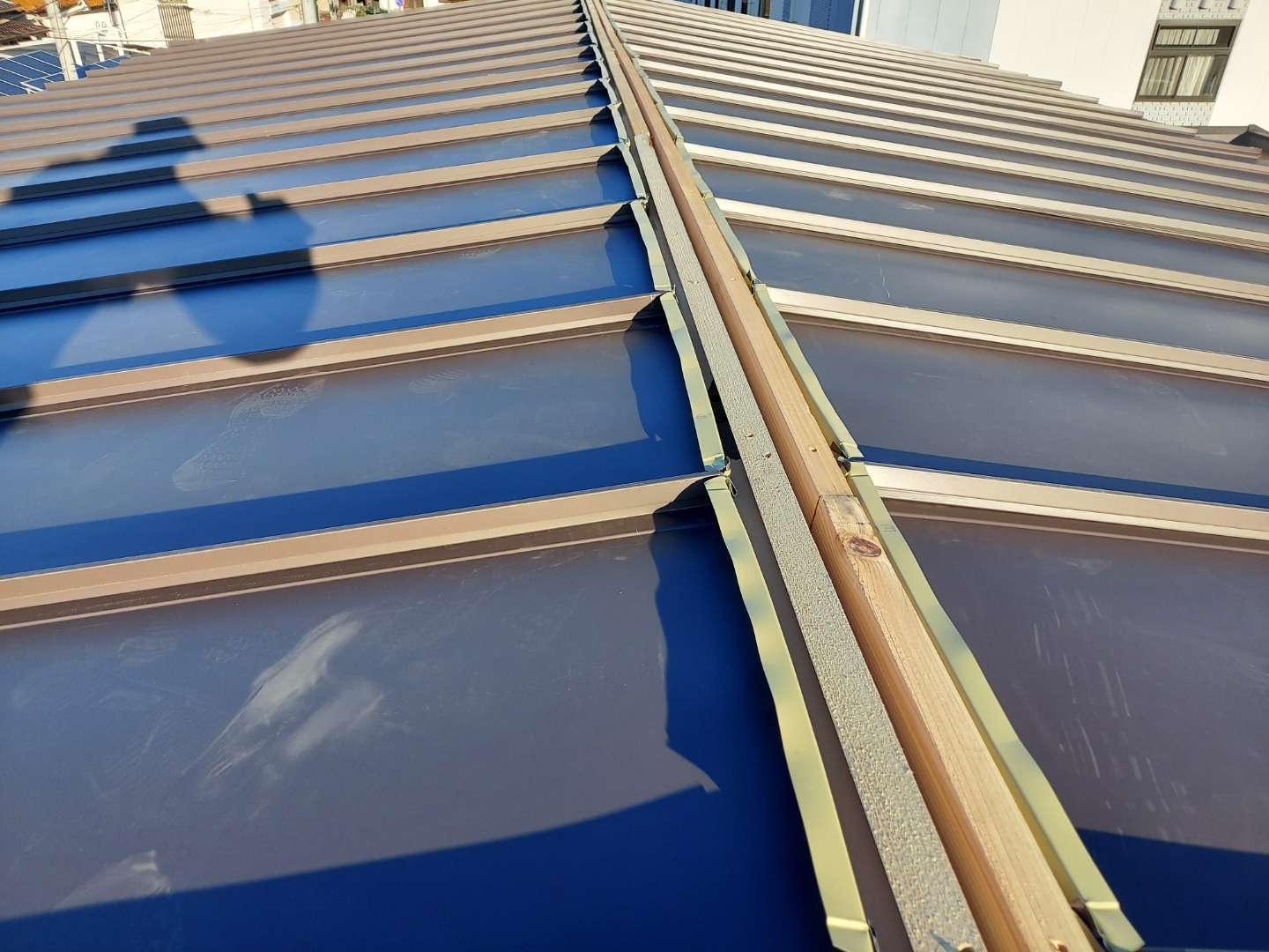 屋根の勾配も緩いため、横葺きではなく、たて葺きの立平ロック32型を使用しました。