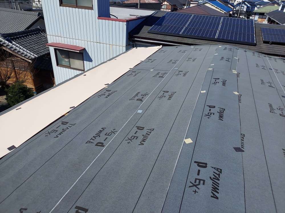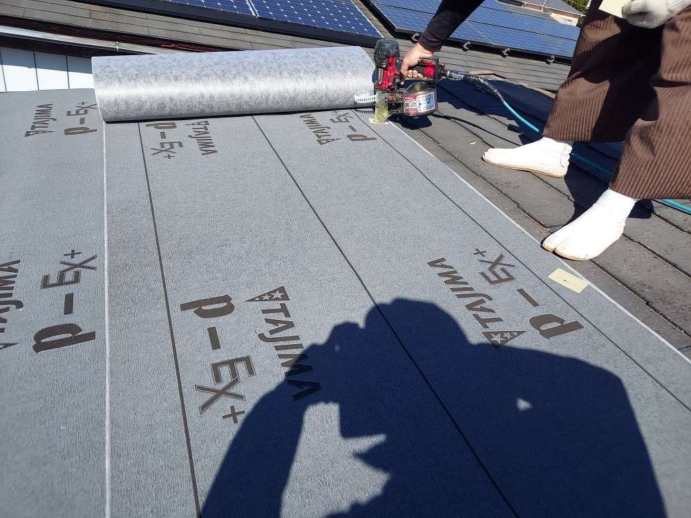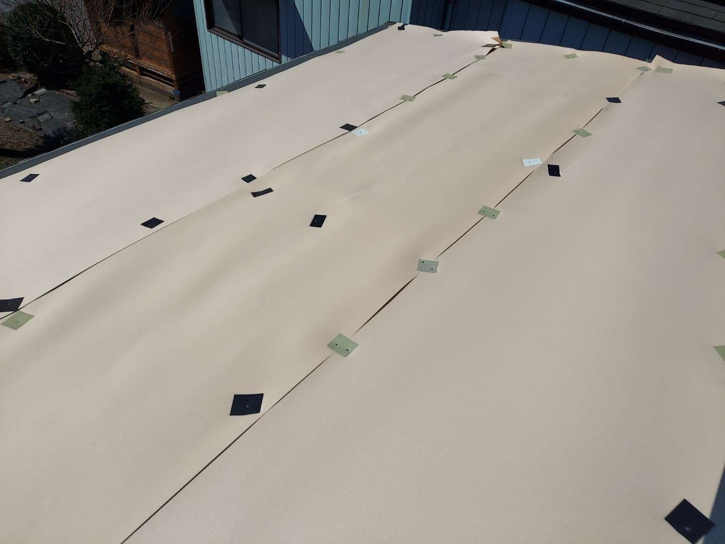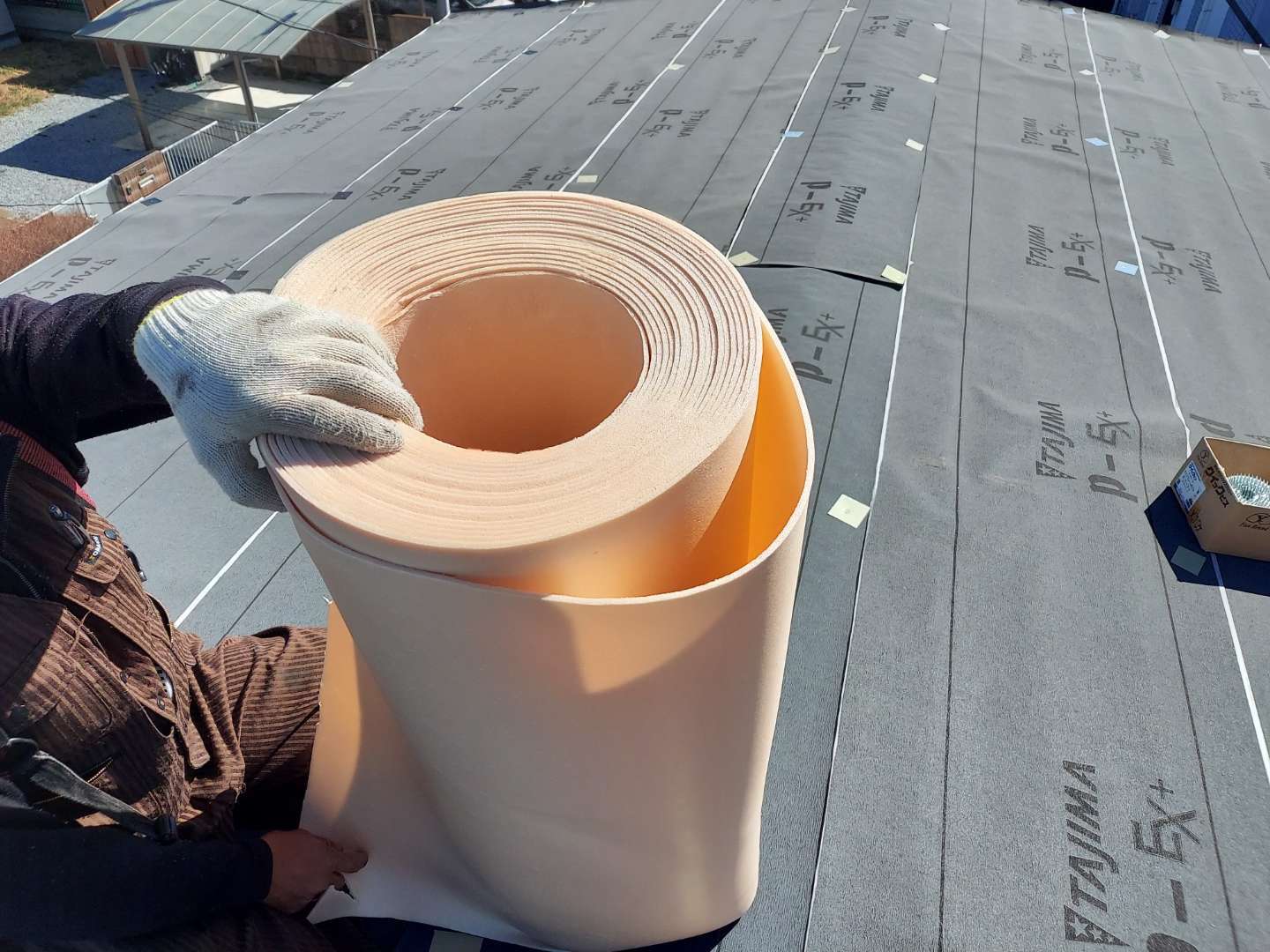 既存コロニアル屋根に立平ロックを使用するにあたって、懸念点があり、コロニアル屋根の上に立平ロックを施工する際、下葺きのルーフィングは施工しますが、ルーフィングだけでは、コロニアルのおうとつが立平ロックに出てしまうため、ルーフィングの上に断熱用のポリエチレンシートを敷きました。