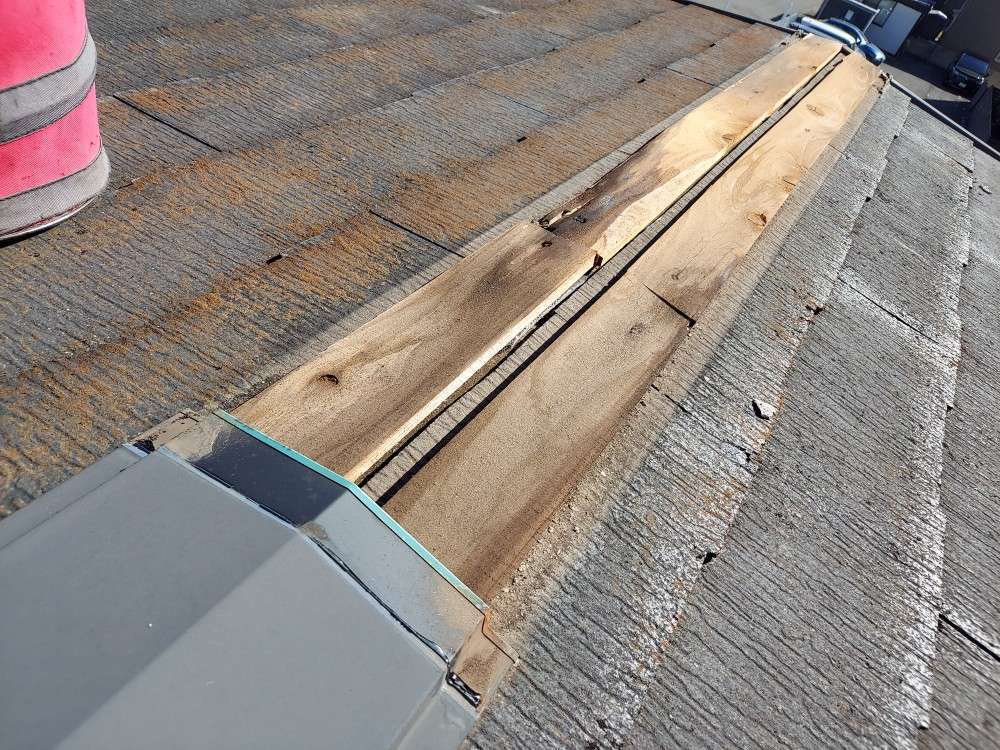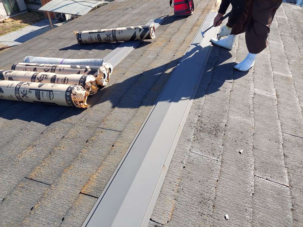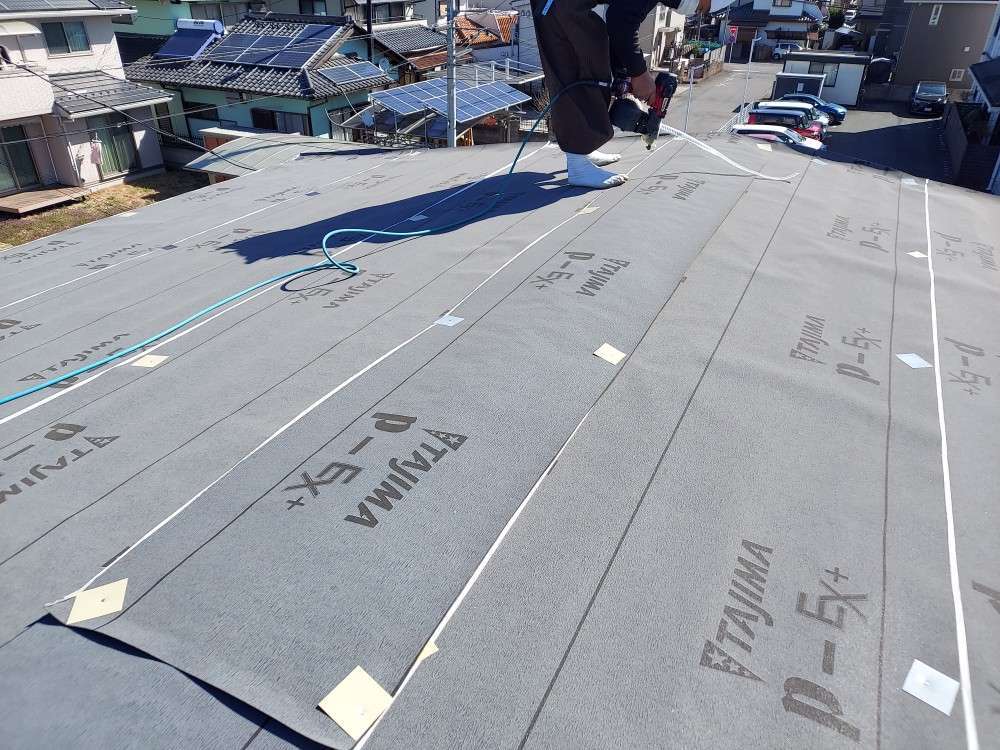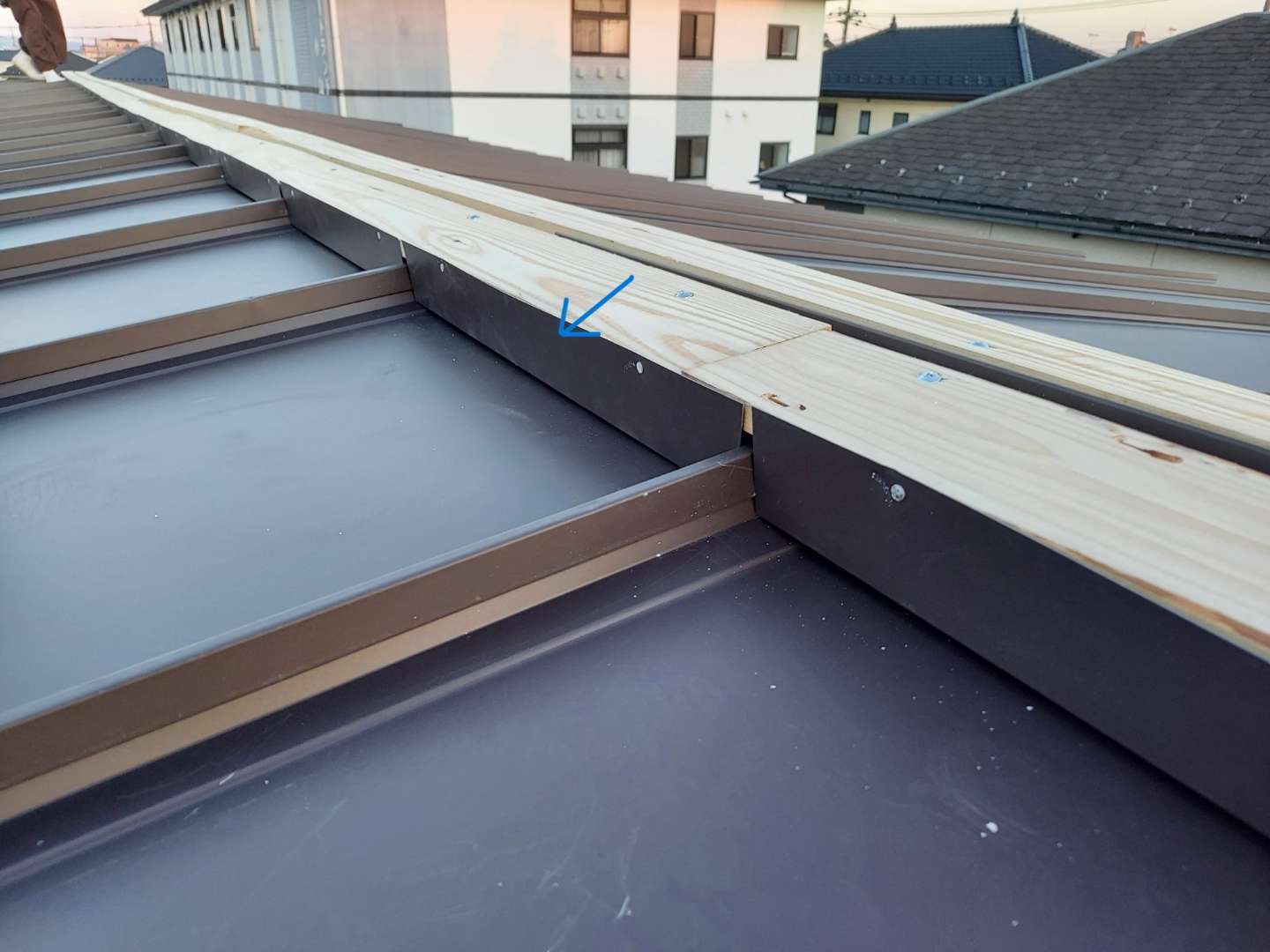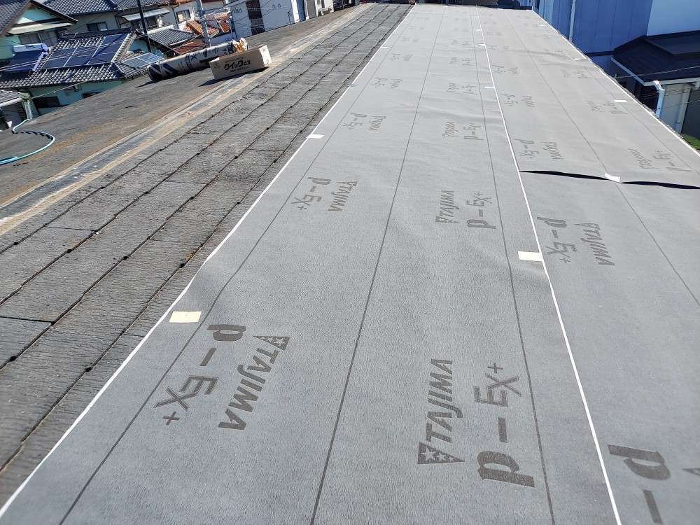 既存コロニアル屋根に立平ロックを使用するにあたって、懸念点があり、コロニアル屋根の上に立平ロックを施工する際、下葺きのルーフィングは施工しますが、ルーフィングだけでは、コロニアルのおうとつが立平ロックに出てしまうため、ルーフィングの上に断熱用のポリエチレンシートを敷きました。