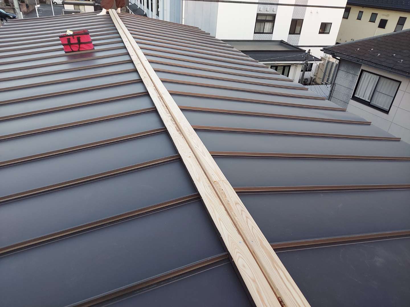 棟部分に、桟木を取り付け立平本体を葺いていきます。