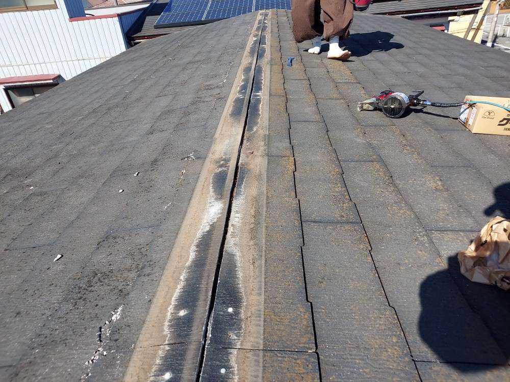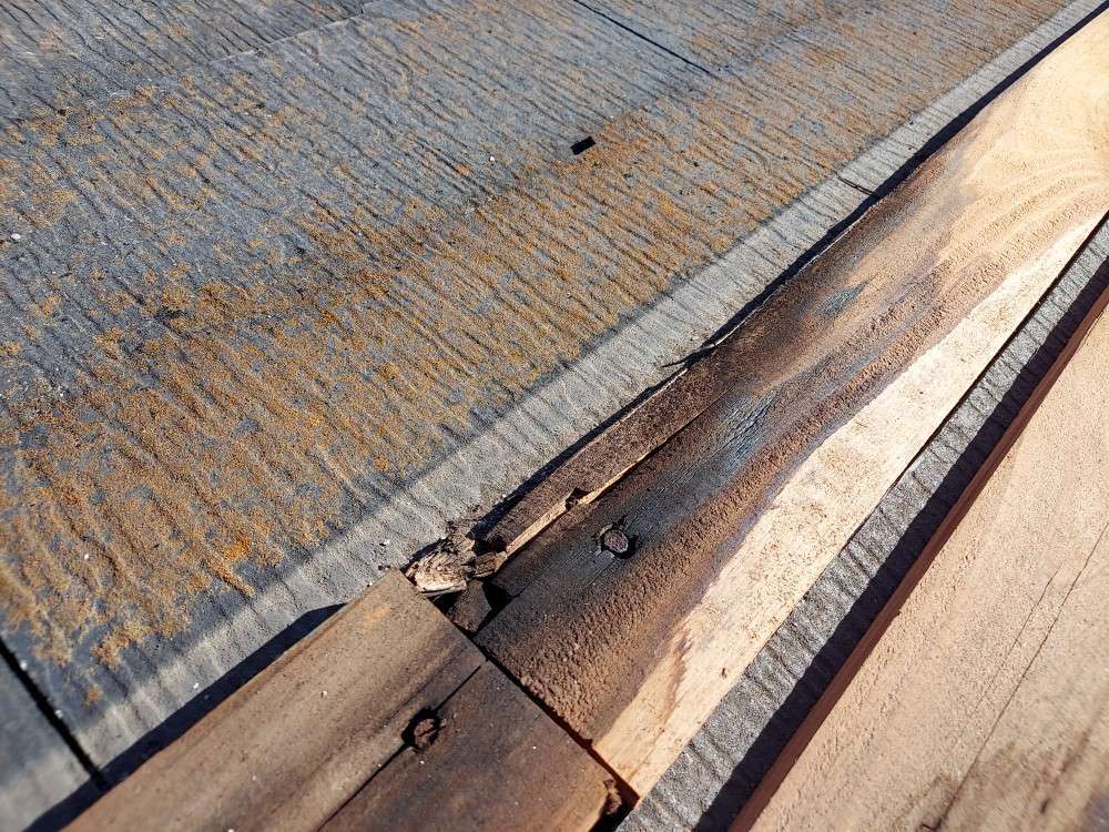 写真でも分かるように、屋根の勾配が緩く、おそらく2寸勾配くらいだと思います。コロニアルは最低でも2.5寸勾配(条件付)は必要です。勾配が緩いと雨水などが屋根に滞留している時間が長くなる為、通常よりも劣化が早くなります。
