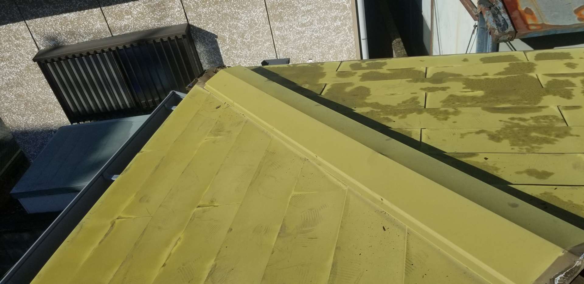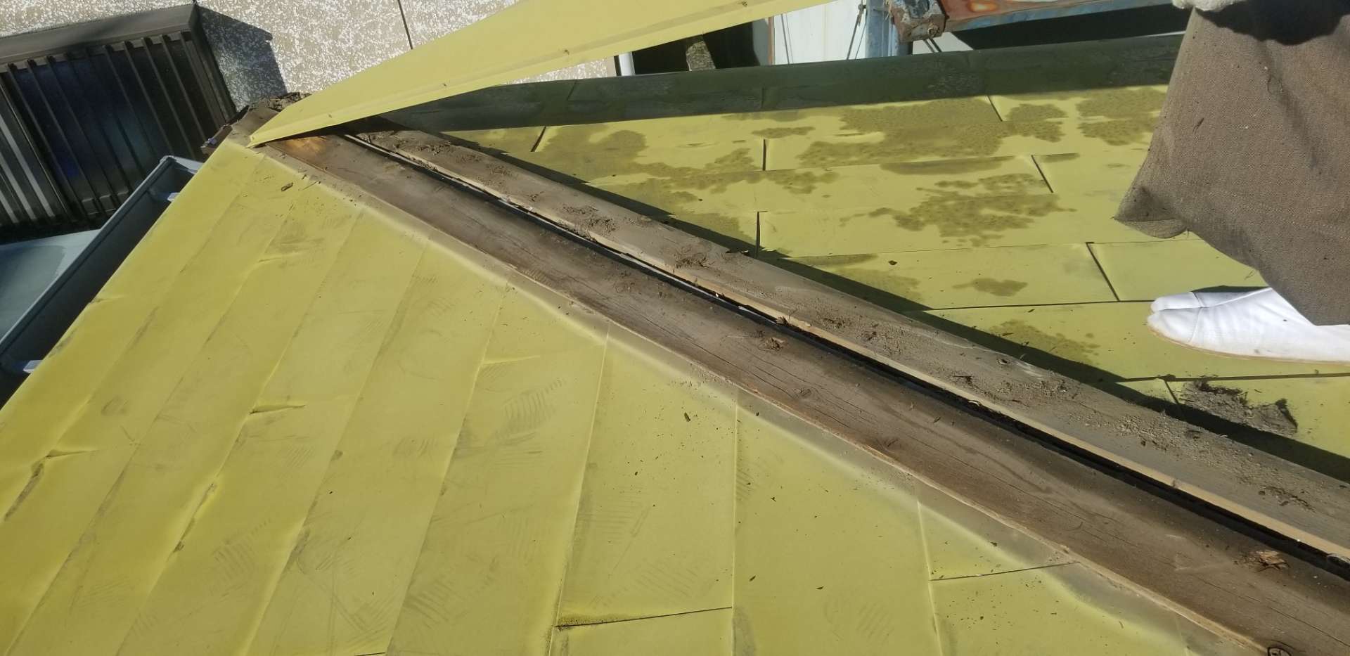 今回の工事は金属製の横葺き屋根の上に、同じく金属製の屋根を葺く工事ですが、屋根の勾配がゆるい為、横葺き屋根ではなくたて葺き屋根へ変更します。