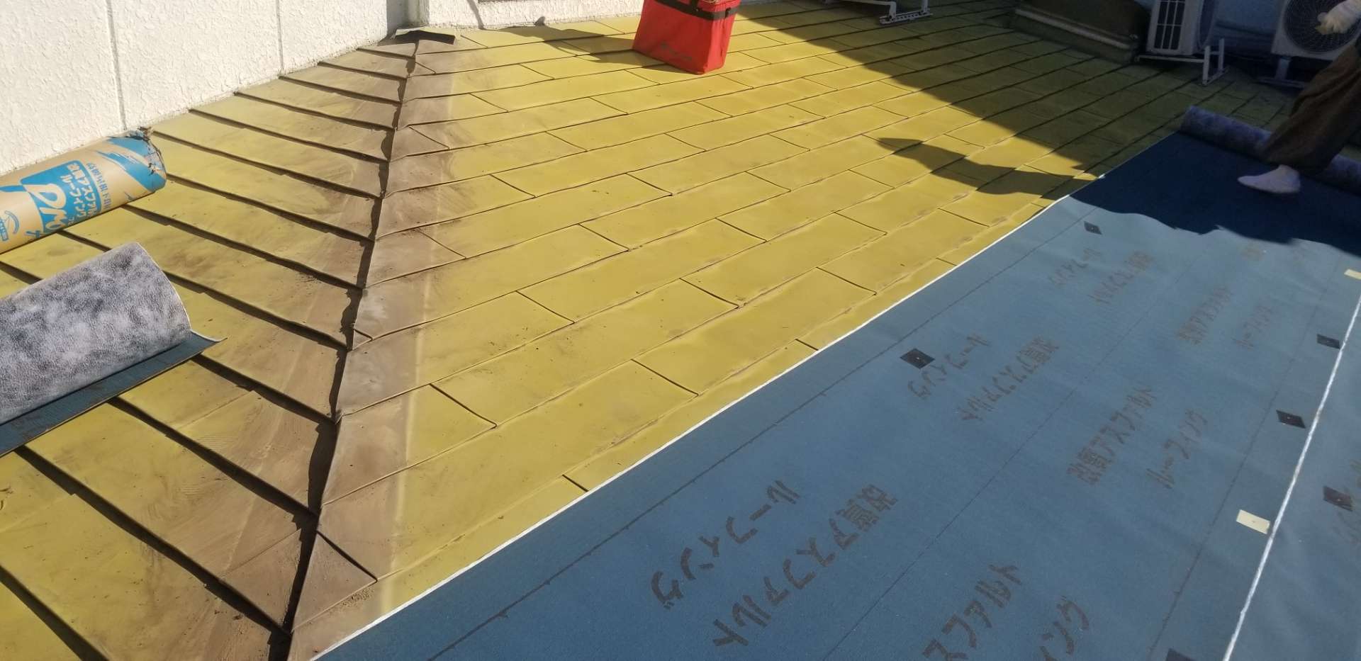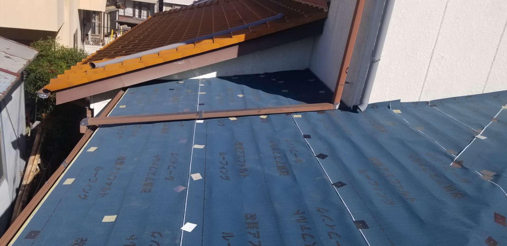 今回の事例は、ルーフィング(下葺き材)までの施工です。立平屋根本体の工事は今月中旬頃を予定しておりますので、その都度ご紹介いたしますので、よろしくお願いいたします。